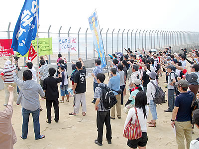 (写真 辺野古の浜で新基地建設を阻止する気概に燃