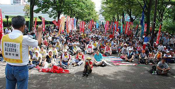 (写真 「ここからが勝負だ」。田中委員長の全力の訴えに真剣に聞き入る全国の労働者【9月15日】)