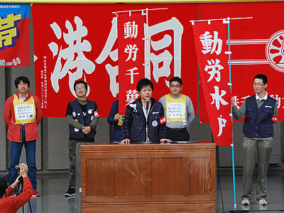 主催者あいさつに立った動労千葉の田中康宏委員長は「世界中がはちきれそうな怒りの声で満ちあふれている。この怒りが国境を越えてひとつになることがいかに重要なことか。万国の労働者は団結できるし、国際連帯こそが労働者の解放につながる」と説き、秘密保護法案やNSC設置法案など改憲と戦争の攻撃を推し進める安倍政権を闘う労働組合の力で打ち破るため、「11月3日に発した憲法改悪反対労組声明を持って全国の労働組合に入っていこう」と呼びかけた。