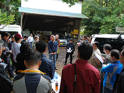 天神峰の市東孝雄さん宅の作業場前に集合し、現地闘争本部の同志の説明を受けながら現地調査を開始した。封鎖された団結街道前のやぐらに交代で上り、滑走路と誘導路によって囲まれた市東さん宅の周囲の状況を確認。さらに市東さんの南台の畑、東峰開拓組合道路、東峰神社、横堀などを訪れ、未完成の欠陥空港としての成田の現実とそれを強制している反対同盟の闘いをつぶさに見て回った。