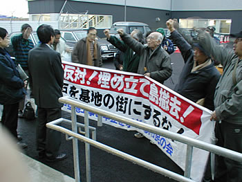 「市民を犠牲にする神戸空港開港ぜったい反対!」「神戸を軍事の街にするな!」。神戸空港開港日の2月16日早朝、神戸空港工事の中止を求める市民の会、関西合同労組、兵庫労組交流センター、百万人署名運動などは、空港島の神戸市事務所(神戸空港は市営空港)に約30人で抗議に押しかけました。市民の会代表・讃岐田訓さんが抗議文を読み上げて手渡し、横断幕を広げ抗議のシュプレヒコール(写真上左)。マスコミも「不安かかえた離陸」などと報道、お祝いムードもなく、抗議闘争以外は寂しい開港でした。