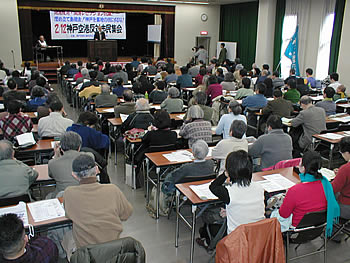 星陵会館で開かれた集会では、国際共同署名運動呼びかけ人を代表して足立昌勝さんが主催者あいさつを行い、民主党・松岡徹参院議員、喜納昌吉参院議員、社民党・近藤正道参院議員らがあいさつした。