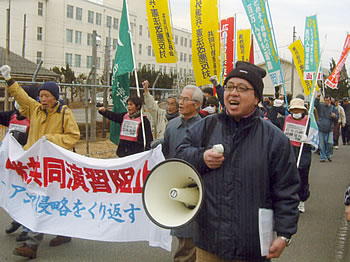 共同演習が行われる那岐山麓に向かって演習阻止のシュプレヒコールを上げ、自衛隊駐屯地に移動した。午前11時、駐屯地正門での抗議申し入れを行い、駐屯地包囲デモに出発した。自衛隊員の注目の中、「自衛隊員は侵略の銃をとるな!侵略戦争のための共同演習に反対しよう!」と訴えながら2`をデモした。