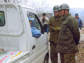 19日午後、内藤秀之さんと大一さん親子が軽トラック2台を連ねて演習場内耕作地への立ち入りを要求した。自衛隊は「農作業以外のたき木伐採などの入会権の行使は認めない」と農民の抵抗を圧殺しようとしたが、堂々と農作業を要求する内藤さん親子の立ち入りを禁止できず、軽トラ2台の立ち入りを認めた。