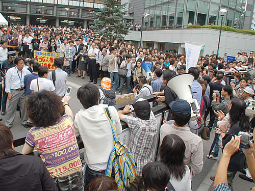 第1日目、総勢百人におよぶ労働者が大会会場前に陣取り、代議員・傍聴者に次つぎとビラやパンフを手渡していった。現場で苦闘する活動家たちが一人ずつマイクを握り、現場組合員を裏切り、その首を郵政公社総裁・生田や新会社社長・西川に差し出す本部方針を激しく批判し、否決することを訴えた。