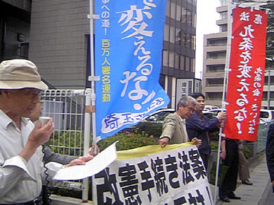 衆議院法務委員会自民党理事である早川忠孝代議士は、私の居住する朝霞市(他に和光市、新座市、志木市と合わせて埼玉4区)から選出されている国会議員です。私は仲間たちとともに、4月28日、早川忠孝氏の地元事務所に次のような申し入れ書を届けました(写真は、朝霞駅前の宣伝活動)。