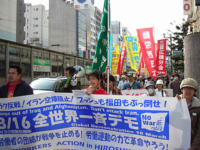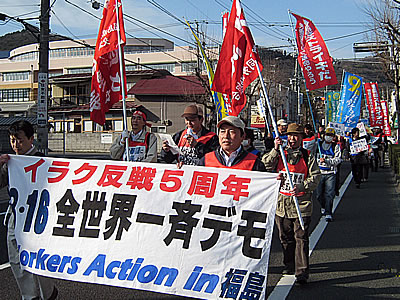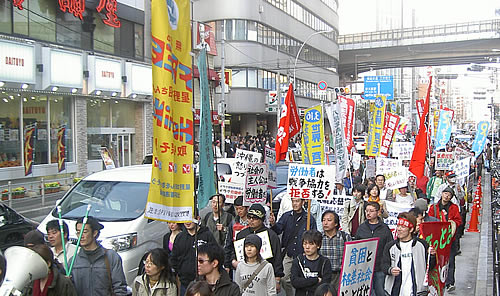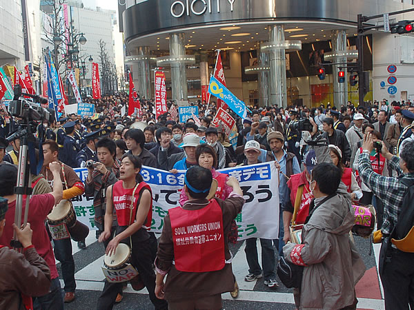 イラク反戦5周年の3・16全世界一斉デモは、日本では1350人が結集した東京・代々木公園を始め全国17都市で、青年労働者と学生を先頭に、自己解放的な戦闘的集会・デモとして闘いとられた。「労働者の団結で戦争をとめよう!」「ブッシュも福田もぶっ倒せ!」のスローガンのもとに、代々木公園での熱気あふれる集会の後、渋谷に繰り出した大デモは、権力のサミット厳戒体制を打ち破り、青年労働者4人の不当な狙い撃ち逮捕をはねのけ、沿道を埋めた人びとと熱く合流しながら、圧倒的にかちとられた。ここに労働者の未来、革命の展望がある。誰もがそれを確信した。この力を直ちに3・30三里塚現地闘争に結集し、労農同盟の革命的前進と三里塚闘争勝利を開こう。そして4〜5月闘争へ進撃しよう。