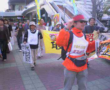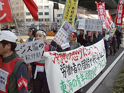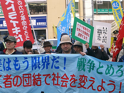3・16イラク反戦全世界一斉行動in沖縄は、沖縄北部合同労組(うるまユニオン)の呼びかけにより青年労働者たちによって企画され、那覇市・県民ひろばに100人が結集した。集会後、国際通りをデモ行進。「資本家どもをぶっとばせ」「リストラやって戦争するな」のシュプレヒコールがとどろいた。あるデモ参加者は「〈労働者>という言葉が鳴り響いたデモは復帰後では初めてだ」と言った。闘いの勝利へ、われわれはその流れをつくった!