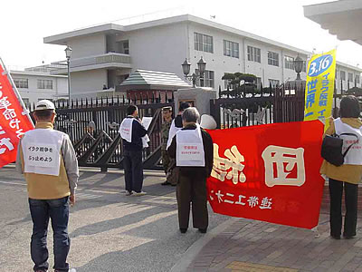 13日は九州からかけつけてくださった80歳を超えるMさん、詩人の石川逸子さん、戦前の天皇制軍国主義教育を受けた方たちが大勢参加。「戦前は視学官がいて教員を監視し、給料まで決めていた。卒業式の監視、人事考課制度による給料査定は戦前と同じこと」と一人ひとりが警備員や都庁職員に切々と訴えかけました。