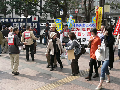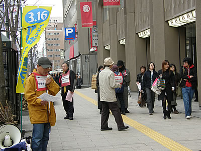 11日から毎日20〜30人が集まり、都庁第二庁舎「ふれあい通り」で午後4時30分から街頭宣伝、5時30分〜6時ごろ都教育庁人事課(27階)または情報課(30階)に訴えに行く行動をしています。27階と30階はいつも警備員を前面に教育庁職員が後方に立って阻止線を張っています。