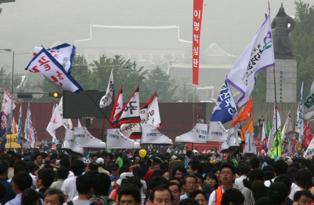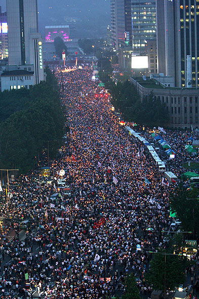 軍事独裁体制を打倒した1987年民主化闘争から21年目の6月10日、百万人のデモ隊の波が再び韓国全土を覆いつくした。「百万ロウソク大行進」が開かれた10日夜、ソウル市内の道路を埋めつくした人民が「牛肉全面再交渉、打倒独裁政権」を叫んで行進した。