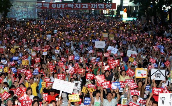 歴史的な決起を前にしながらもイミョンバク大統領は6日、「米国との再交渉不可」の意志を明らかにした。青瓦台外交安保首席室は「国民が望むとおりにしたら青瓦台が『反米』になってしまう」と再交渉不可方針にしがみついている。10日にはハンスンス首相を始め全閣僚が辞任したが、イミョンバク打倒まで闘いがやむことはない。