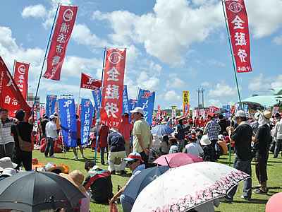 「いざ暁の出陣!」と冗談を飛ばしながら、午前5時、私たちは県民大会へ出発しました。わくわくする気持ちをいっぱい込めて、午前9時前から集まり始めた参加者に「『太希おきなわ』は退所強制を白紙撤回せよ」と訴えました。用意した千枚のビラはあっと言う間に全部なくなりました。