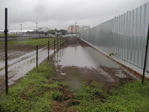 第3誘導路建設工事による新たな営農被害が発生した。写真にあるとおり、萩原進事務局次長宅で耕作している畑(通称「横川の畑」)で重大な冠水被害が起きた。9月28日、前夜から降り続いた雨が畑にたまって冠水状態になった。写真の右方向に見える誘導路工事のための鉄板フェンスのコンクリート製基礎が、畑の際をふさいだために排水が阻まれ、雨水がたまってしまったのだ。畑にあるのは育ち始めた人参。まだ小さいので、冠水被害を受ければ腐ってしまう。まき直しはできず被害は甚大だ。 |