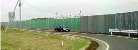 〔写真の説明・緑色部分が本格フェンスで、ねずみ色(トタン板)部分が後で取り壊す仮設フェンス。本格フェンス部分は、暫定滑走路が完成したときには空港外周道路として使うことが工事計画に書かれている。つまり、団結街道を復活させることは工事計画にはなく、外周道路を団結街道の代用にする計画だったということだ。団結街道は空港敷地内に位置し、暫定滑走路横を走っているため、空港公団は何としても破壊する計画だった。しかし、反対同盟の闘いによってそれも粉砕されようとしている。〕
