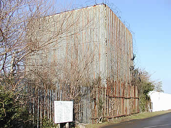 (写真 朝日に映える天神峰現闘本部【2月9日撮影】。NAAはこの外側の鉄骨造りと内側にある木造建物が「一体でない」と主張した)