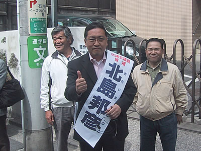 (写真 市東孝雄さんと鈴木謙太郎さんは北島邦彦候補の応援にかけつけ、出陣式と第一声でマイクをとった【4月15日 杉並】)