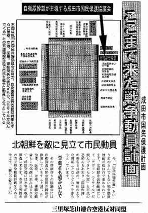 成田空港をめぐって今、次々と軍事基地化に向けた攻撃がかけられている。(1)成田市国民保護協議会に自衛隊の習志野空挺団大隊長が参加して、国民保護計画を作成していた問題、(2)米軍が今春にも成田空港の使用を前提とした現地調査に来る問題、(3)3月30日、自衛隊PKO部隊が制服のまま成田から出発し、これを50人もの制服自衛官が見送った事実。今回のビラで反対同盟はこれら保護の事実を暴露し、弾劾した。
