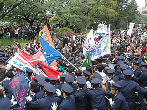 5月15日、16日、日帝・警視庁、警察権力は「暴力行為等処罰に関する法律」(暴処法)違反をデッチ上げて、全学連・織田陽介委員長や法政大学文化連盟委員長・斎藤郁真君ら11人を不当逮捕した(4・24法大解放闘争で逮捕されていた恩田亮君、倉岡雅美さん、5・12法大デモで逮捕された織田委員長は再逮捕)。絶対に許せない! 2006年3月14日以来、3年有余の法大闘争での逮捕者はなんとのべ107人、起訴は24人だ。全国学生・労働者・農民の怒りの反撃で粉砕しよう!