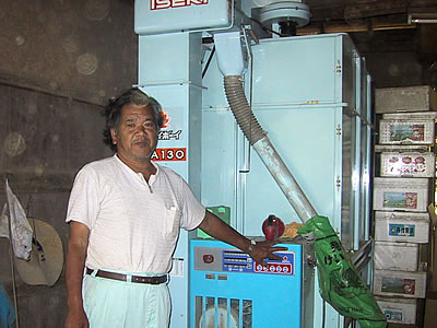 9月16日、市東孝雄さん宅、9月14日、鈴木幸司さん宅で恒例の稲刈りが行なわれた。市東さんでは8俵の豊作。鈴木さん宅でも例年よりはるかに多い収穫高となった。(写真左は市東さん=右=と萩原富夫さん。写真右の鈴木さんは乾燥作業)