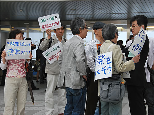 開会前段から組合員OBが立ち上がった。手に手に「OB排除を許すな」のボードを持ち委員長を断罪。ついに終日の傍聴を実現した。三教組運動への誇りにかけた決起が現場組合員を鼓舞し、緒戦から打倒意志を突きつけた。