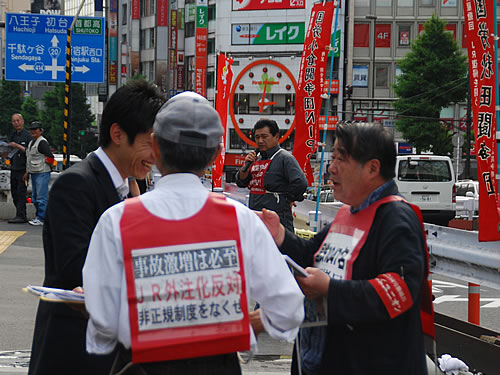 原告を先頭に「共に闘う国労の会」はこの日、朝は東京地裁前、裁判終了後はJR東日本本社前で、国鉄解雇撤回10万筆署名を呼びかけ、常磐線の竜田延伸反対を訴える宣伝行動を貫徹した。