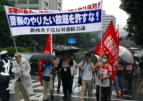 法制審特別部会開催に対し7月9日昼、新捜査手法反対連絡会議主催の霞が関デモが65人で闘われ、法務省を始め、警視庁・検察庁・裁判所に怒りをたたきつけた。