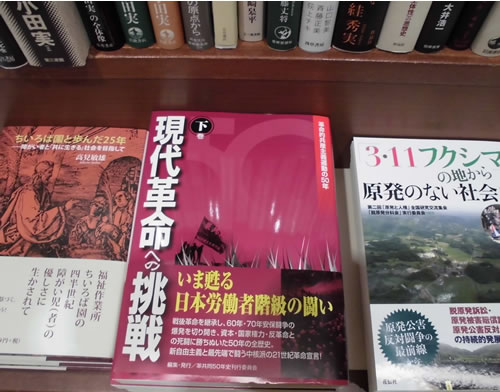 神保町の書店を始め、平積みにしている書店も多数。上・下巻セットで置いている書店も。斬新なカラー・海老茶色の表紙、392㌻の重量感、「革命」「中核派」の大胆な文字。見劣りしない迫力を感じました。