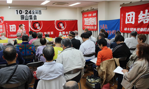 全関西集会は10月24日、全国水平同盟西郡支部、関西労組交流センター、八尾北医療センター労組が共催し、八尾市西郡第3集会所に95人が結集した。水平同盟高槻支部と植木団地労働組合が参加し、部落解放闘争にとって決定的な一歩を記す集会となった。