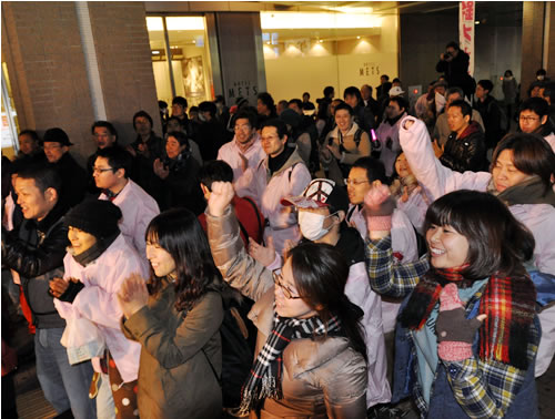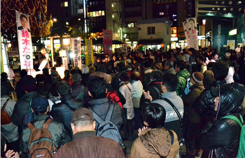12月6、7日、鈴木候補の駅頭大演説会が2日連続で行われた。6日は阿佐ケ谷駅南口に300人、7日は高円寺駅北口に500人もの聴衆が集まり、インターネットで同時配信された動画の視聴者数は1万人近くに達した。「私は一人じゃない。全国の職場で闘う労働者の支持、福島・沖縄の怒りの声、そして日本の労働者の闘いの歴史を背負って、私は国会に乗り込む!」――鈴木候補の熱弁に、集まった人びとが万雷の拍手で応えた。