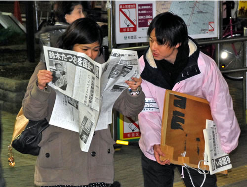 また街宣現場では『前進』が連日100部以上も手渡された。食い入るように読み、その場で「鈴木さんに決めました」と表明する労働者も。さらに、街宣で知り合ったばかりの女性がその場でボランティア登録をして連日ビラまきに決起するなど、鈴木候補への区民の注目が行動へと転化されていった。