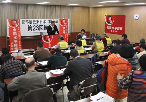 12月19日、部落解放東日本共闘会議第23回総会が東京・中央区浜町会館で開催され、50人が結集した。衆院選決戦の熱気と高揚感が会場にあふれる中、強制執行を打ち破った西郡住宅闘争と結合することで、全国水平同盟高槻支部と植木団地労働組合が結成された1年を総括。闘う路線への確信を深め、安倍政権を打倒する2015年決戦への突入を宣言した。