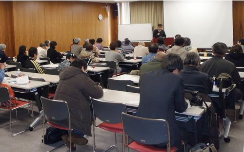 (写真 ふくしま共同診療所の取り組みを報告する杉井吉彦医師の話に、全道からの参加者は熱心に聴き入った【12月14日 札幌市】)
