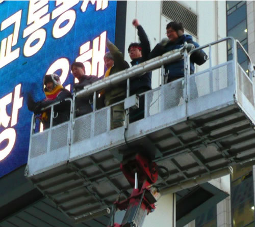 午後5時過ぎ、高所作業車に乗って広告塔に上がった民主労総ハンサンギュン新委員長や支援者5人と合流したイムジョンギュン氏とカンソンドク氏の2人は、広告塔の上から力強く発言した。ハンサンギュン委員長らとともに地上に下りてきた2人は、参加者たちとの交歓後、治療・検査のため、救急車に乗って病院に向かった。