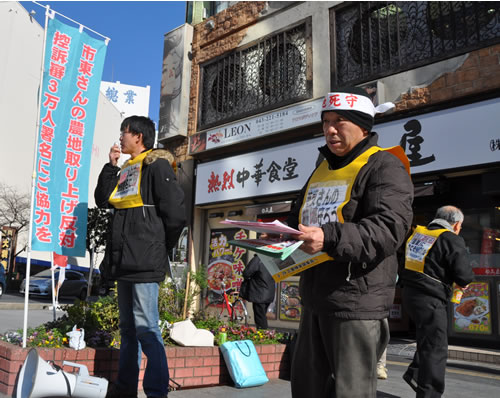 午後から反対同盟と支援連絡会議は、恒例となった千葉市繁華街での3万人署名情宣に立ち、寒風をはね返して労働者・市民に農地取り上げ反対、安倍政権打倒を熱烈に訴えた。