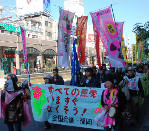 県外団体を先頭に、のぼり、旗、横断幕、プラカードを掲げた長蛇のデモ隊が市の中心街に繰り出した。ひときわ元気の良い隊列はNAZEN福岡をはじめとしたNAZENや福岡県労組交流センターなどの隊列だ。織田陽介事務局長の太鼓のリズムに合わせ、青年が代わる代わる「川内原発再稼働反対!」「すべての原発いますぐ廃炉!」「安倍政権倒そう!」「福島ふるさと返せ!」と怒りのコールを上げながら進んだ。沿道から激励の声が飛び、飛び入りも加わり、隊列は50人近くに膨れ上がった。