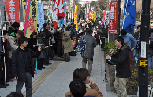 警察権力が大量に動員された厳戒態勢のもとで、日本共産党をはじめ既成左翼とそれに連なる諸勢力もいました。彼らは「安倍は後藤健二さんを救え」というスローガンを唱えて安倍に懇願し、安倍政権の戦争体制づくりに加担する姿をさらしていました。