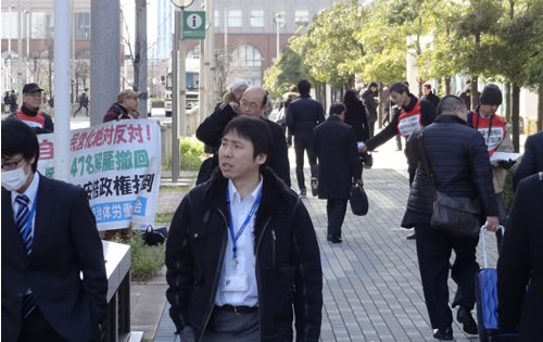 多くの労働者が1・26国会行動の写真に注目し、歩きながらビラを読んでいきます。革共同の声明、「中東・欧州・全世界人民に訴える/大恐慌・戦争を革命へ」を掲載した『前進』にものすごい注目が集まり、用意した100部はたちまちなくなりました。労働者は誰しも大恐慌と戦争、日帝自身の参戦の情勢に対して、明確な指針と闘いの路線、現実の行動を求めているのです。