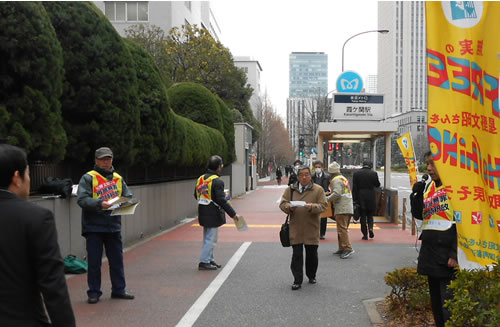 裁判に先立って裁判所前で、全証拠開示を求める100万人署名の宣伝活動が行われた。(写真)