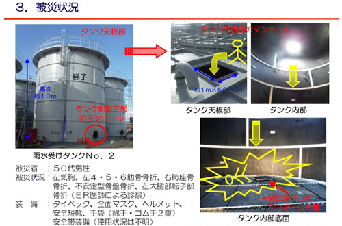 東電は建設中の雨水受けタンクの検査を行おうとしたが、タンク内が暗かったことからタンク天板部より太陽光を入れるため釣さんが一人でタンク上部へ登り、天板部にある重さが51㌔もあるマンホールの蓋を動かしたところ、マンホールの蓋とともにタンク内へ墜落(高さ約10㍍)したというものである。