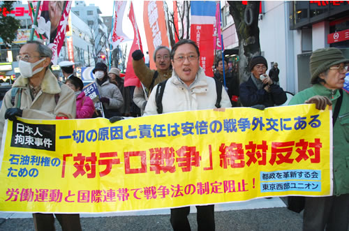 2月21日、東京西部ユニオンが呼びかける15春闘行動は、夕方、杉並区・阿佐谷での「安倍たおせ」デモで始まった。西部ユニオン青年部のコールが街頭に響き渡った。沿道でビラと『前進』速報版が次々に手渡され、デモは注目の的だ。