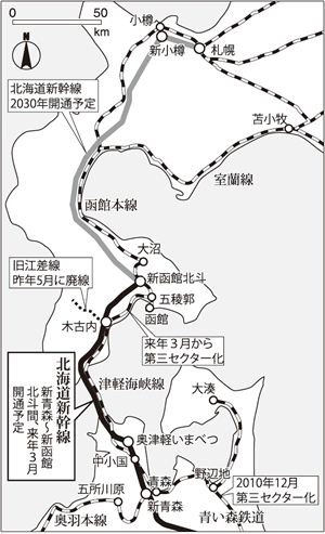 来年3月の北海道新幹線開業に際しては、江差線の木古内―五稜郭間が第三セクターの「道南いさりび鉄道」に移管される。昨年5月には江差線の江差―木古内間が早々に廃止されバスに転換された。「道南いさりび鉄道」は、10年間で23億円もの大赤字が見込まれ、道や沿線自治体の財政支援を受けることになっている。JRから購入する線路などの鉄道施設は老朽化している。JRが経営している現在でも事故が多発しているため、安全対策費と要員を当初予測を超えて増やさなければならなくなったのだ。しかも開業時の輸送密度(1日1㌔あたりの乗客数)632人が、10年後には487人まで落ち込むと予想されている。