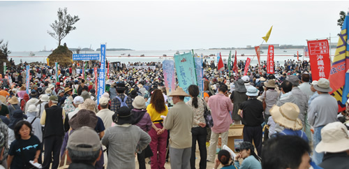 当日は集会開始の1時間以上前から大型バスが沖縄全島から次々と結集し、集会参加者は集会が始まる午後1時をすぎてもとぎれることはなかった。その数は「二見(ふたみ)以北十区」(辺野古より北に位置する名護市東海岸地域)の人口約1600人を倍する結集だ。