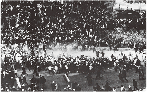 (写真 1968年3月10日、成田市営グラウンドで農民・学生・青年労働者が機動隊と激突。空港絶対反対の声を圧殺する政府・空港公団に怒りが爆発)