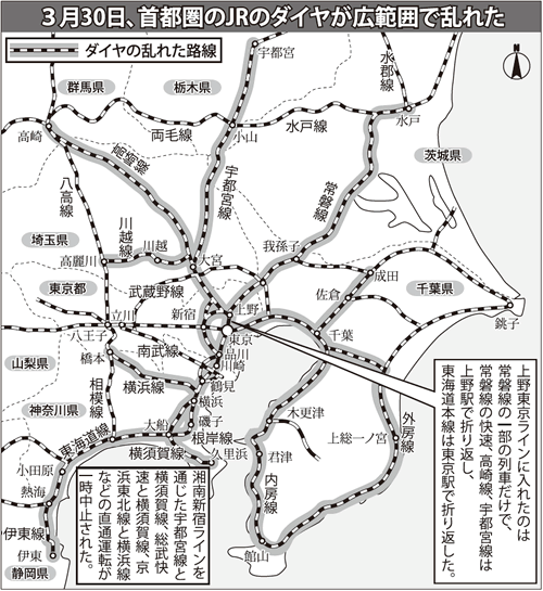 3月30日午前7時5分頃、横浜市鶴見区のJR京浜東北線・鶴見駅で、男性が電車にはねられ死亡した。JR東日本の発表によれば、この事故により京浜東北線の大宮―大船駅間と、隣接する東海道線の東京―熱海駅間で運転を見合わせたが、午前8時過ぎには運転を再開したという。だが、ダイヤの混乱は首都圏全域に広がり、午後になってもそれは続いた。上野東京ラインを通じての宇都宮線、高崎線と東海道線の直通運転は中止され、宇都宮線、高崎線は上野で折り返し、東海道線は東京で折り返した。上野東京ラインに乗り入れたのは、特急などの常磐線の一部の列車に限られた。