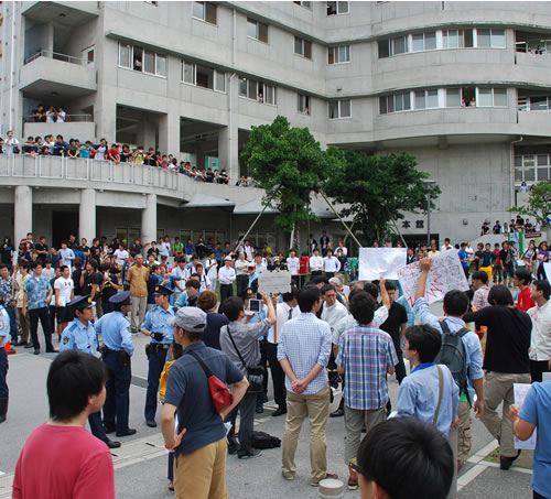 安倍政権は国会での戦争法制定を進めるとともに、沖縄の怒りを踏みにじって名護市・辺野古への米軍新基地建設工事を進めています。沖大生は「これを絶対に阻止したい!」という思いから、昨年5月にキャンパス反戦集会を行い、全学シール投票で学生自治会を再建しました。