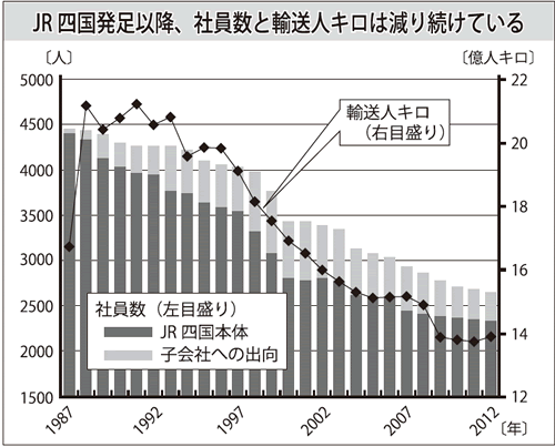 またJR四国の全259駅のうちすでに80%が無人化されている。JR四国唯一の工場である多度津工場では、発足時に600人いた労働者が今は200人に削減され、うち100人は外注会社の社員だ。