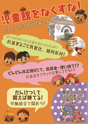 「児童館をなくすな!署名」は、杉並区立施設再編整備計画の白紙撤回を求める「丸ごと民営化による組合・地域の破壊を許すな!」の運動です。鈴コン分会の解雇撤回・原職復帰、荻窪郵便局の賃下げ撤回、アメアパ分会の解雇撤回命令をかちとった東京西部ユニオンが中心になって進めています。都労連傘下や全労連系の労組でも「丸ごと民営化なんて認めちゃいけない」「署名を取り組みたい」と声が上がり、国鉄闘争破壊の10年4・9政治和解を打ち破る闘いに。児童館労働者が「反対してもらってありがとう」「何も情報がなくて不安」と語り、長年民営化に協力してきた日本共産党の支配を覆す闘いになっています。