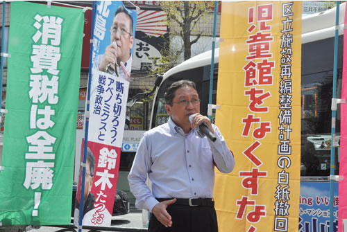 北島邦彦候補を押し立てた杉並区議会議員選挙(定数48、4月26日投票)の圧勝へ激動の1週間決戦に突入した。ゼネストで安倍倒そうと訴える北島候補の演説は街頭を揺るがしている。14日JR阿佐ケ谷駅での演説を紹介します。(編集局)