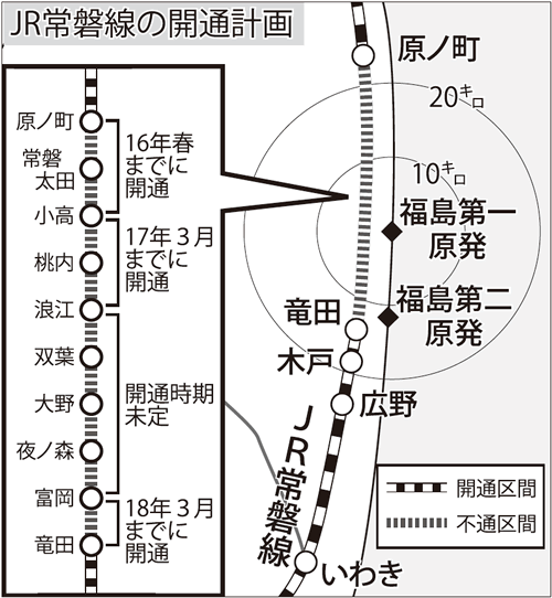 昨年の動労水戸の常磐線竜田延伸阻止闘争は、原発事故避難者の圧倒的な支持を得て、原発労働者・除染労働者との結合をかちとる原動力となった。それは労働組合の「命・安全・地域」を守るための闘いが、全人民をひとつに団結させられることを証明した。その力関係が、原発再稼働と福島切り捨てを策する安倍政権を万力のごとく締め上げている。追いつめられた安倍政権は、3月10日、「常磐線全線開通」を政府方針として決めた。小高―原ノ町間(9・4㌔)は16年春まで、浪江―小高間(8・9㌔)は17年3月まで、竜田―富岡間(6・9㌔)は18年3月までの開通をそれぞれ目指すとしている(上図)。